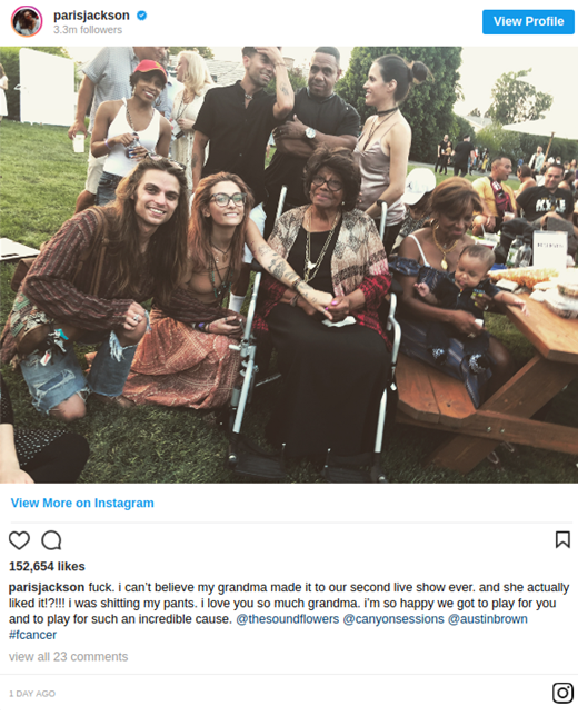 The green-eyed stunner posted sweet pics of her kneeling beside her 88-year-old grandmom along with her bandmate and friends. Paris had always been attached to her grandparents and it was evident from what she wrote beneath. “F***! I can’t believe my grandma made it to our second live show ever. And she actually liked it!?!!”, Paris tweeted. “I love you so much, grandma. I’m so happy we got to play for you and play for such an incredible cause”, she added. We are pretty sure the young and beautiful daughter of Pop King Michael Jackson was all excited to see her grandma being present for her band’s concert.