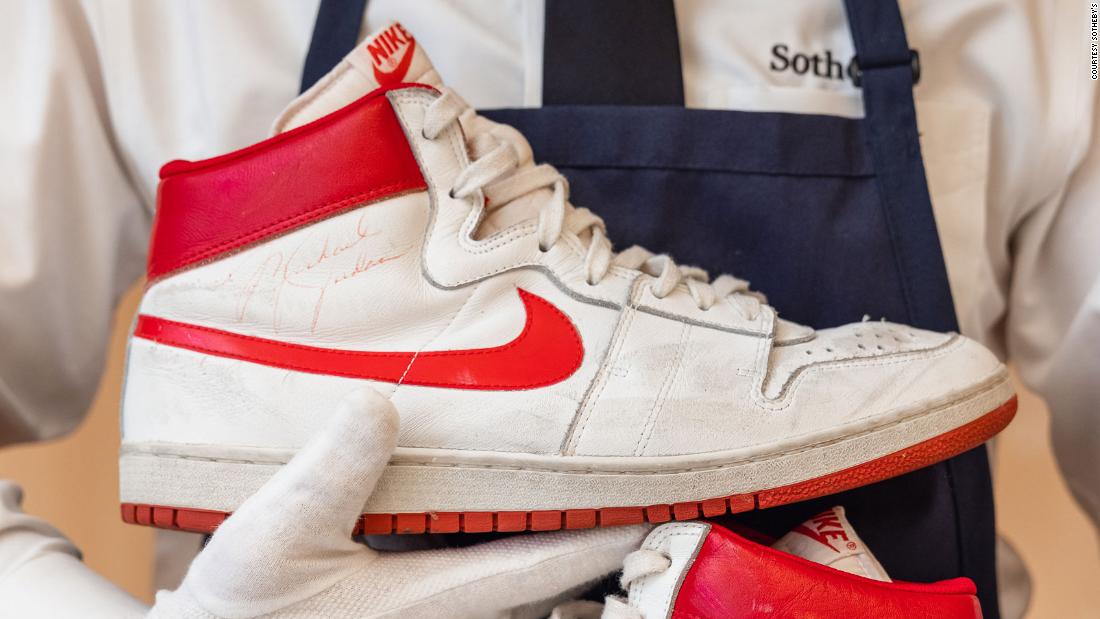 A pair of Nike Air Ships sneakers worn by Michael Jordan during his fifth NBA game with the Chicago Bulls…