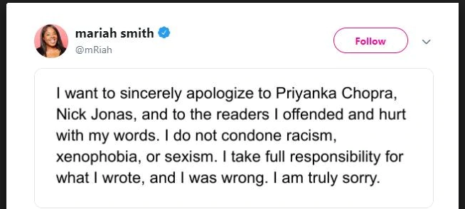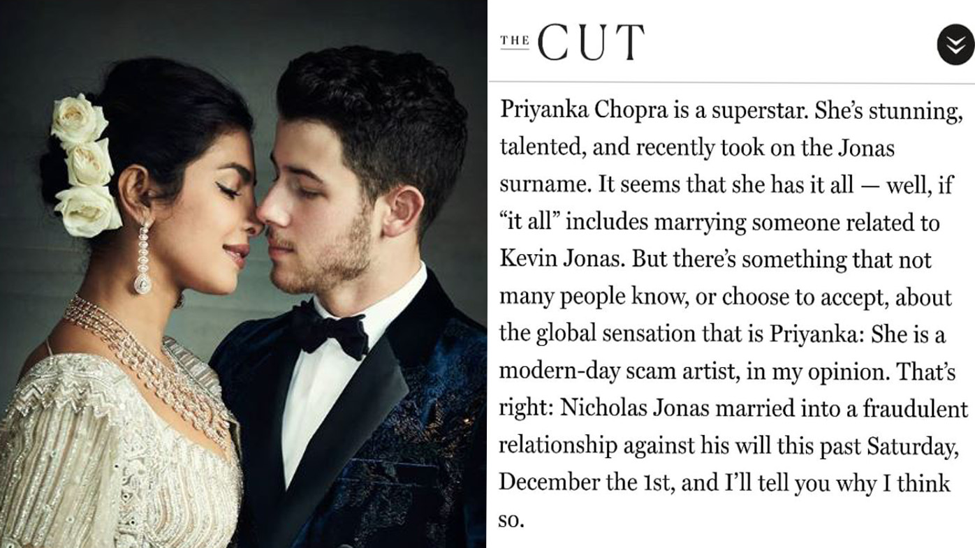 The CUT writer Mariah Smith wrote an article stating that Priyanka Chopra is a Global Scam Artist who is just trying to be more popular and make money from her wedding. The writer also stated that Nick Jonas married to a fraudulent artist and the Big Lavish Wedding was thrown just to make money like those Celebrities who sell their babies and wedding pictures for money.